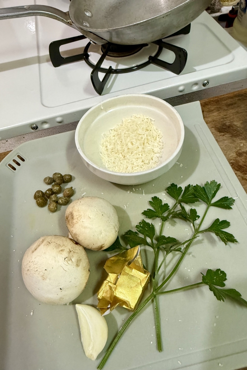 昨晩の夕食は、2個残った大ぶりマッシュルームの消化試合です。