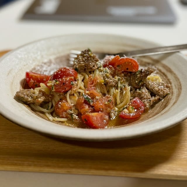 かき混ぜずに食べます。トマトだけ、オイルだけ、肉だけ、たまにチーズかかってたり、部分によって味わい変わり楽しく飽きません。冷いサルシッチャも、ハーブが効いてるので違和感なし。ガロファロの1.5mm、冷製によく合うと思います。オススメです!